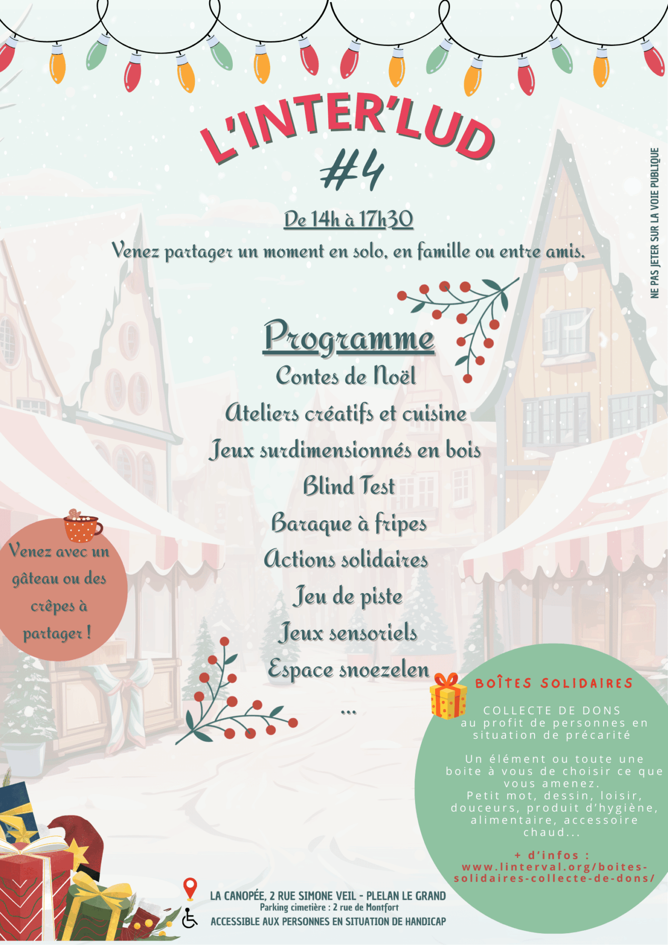 Différents ateliers auront lieu : fabrication de cartes de vœux, création d’une fresque, ateliers décorations de noël en tout genre, cuisine, malles sensorielles, espace Snoezelen, contes, blind test, jeux de société avec la ludothèque Au bois des Ludes ….